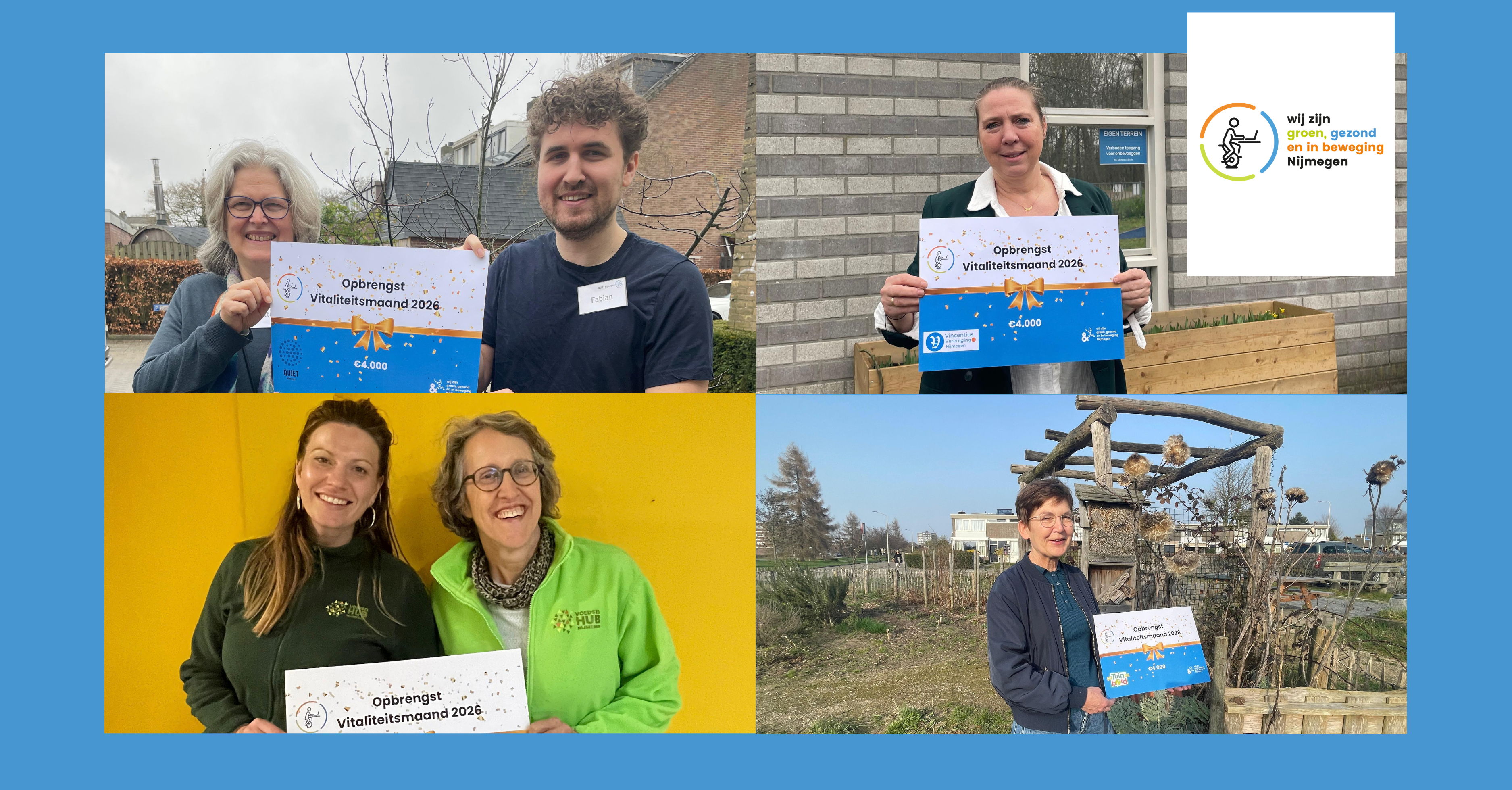 Het bedrag gaat naar vier organisaties die zich dagelijks inzetten voor mensen in Nijmegen die hulp kunnen gebruiken: Vincentius Vereniging, Stichting Quiet, Huis van Compassie en Van Tuin tot Bord. Elk goed doel ontvangt €4.000 voor hun activiteiten.