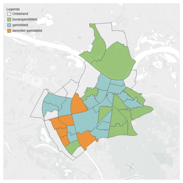 Nijmegen is aantrekkelijk om in te wonen en leven. Uit een enquête van de gemeente Nijmegen blijkt dat Nijmegenaren hun woonomgeving ruim voldoende tot goed vinden. Het rapportcijfer voor de buurt als plek om te wonen en leven schommelt rond de 7,5 sinds 2010. Natuurlijk zijn er verschillen tussen de buurten en wijken, zoals in de figuur hieronder te zien is. In Nijmegen-Noord en delen van Nijmegen-Oost, -Zuid en het Centrum zijn mensen bovengemiddeld tevreden, terwijl dit bijvoorbeeld minder is in delen van Dukenburg en Nijmegen-Zuid. Ben je benieuwd hoe jouw wijk ervoor staat? Ga dan naar de Leefbaarometer en zoom in op Nijmegen en op jouw wijk.